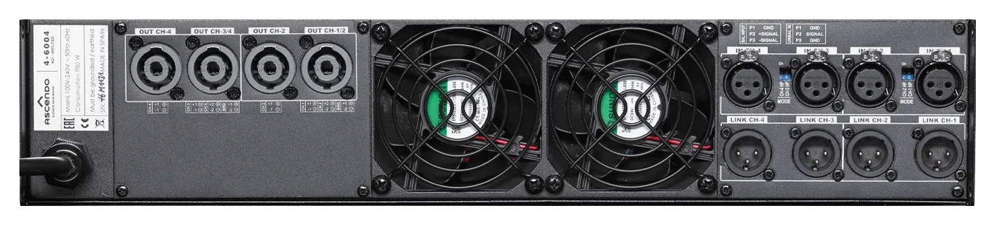 230 V @ 4 Ω: 4 x 1500 W 230 V @ 8 Ω: 4 x 800 W